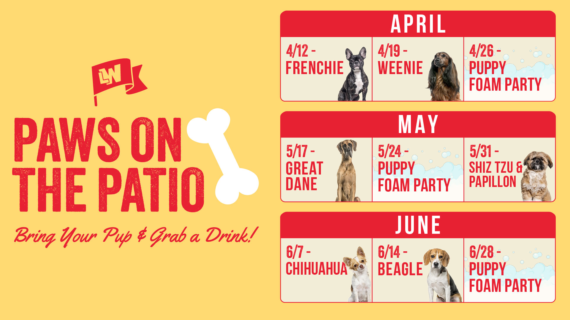 Little Woodrow’s “Paws on the Patio” is your go-to weekly dog social, bringing together pups, patio vibes, and cold drinks all season long. From Frenchies and Weenies to Great Danes and Chihuahuas, each weekend features a different breed spotlight plus fan-favorite puppy foam parties.