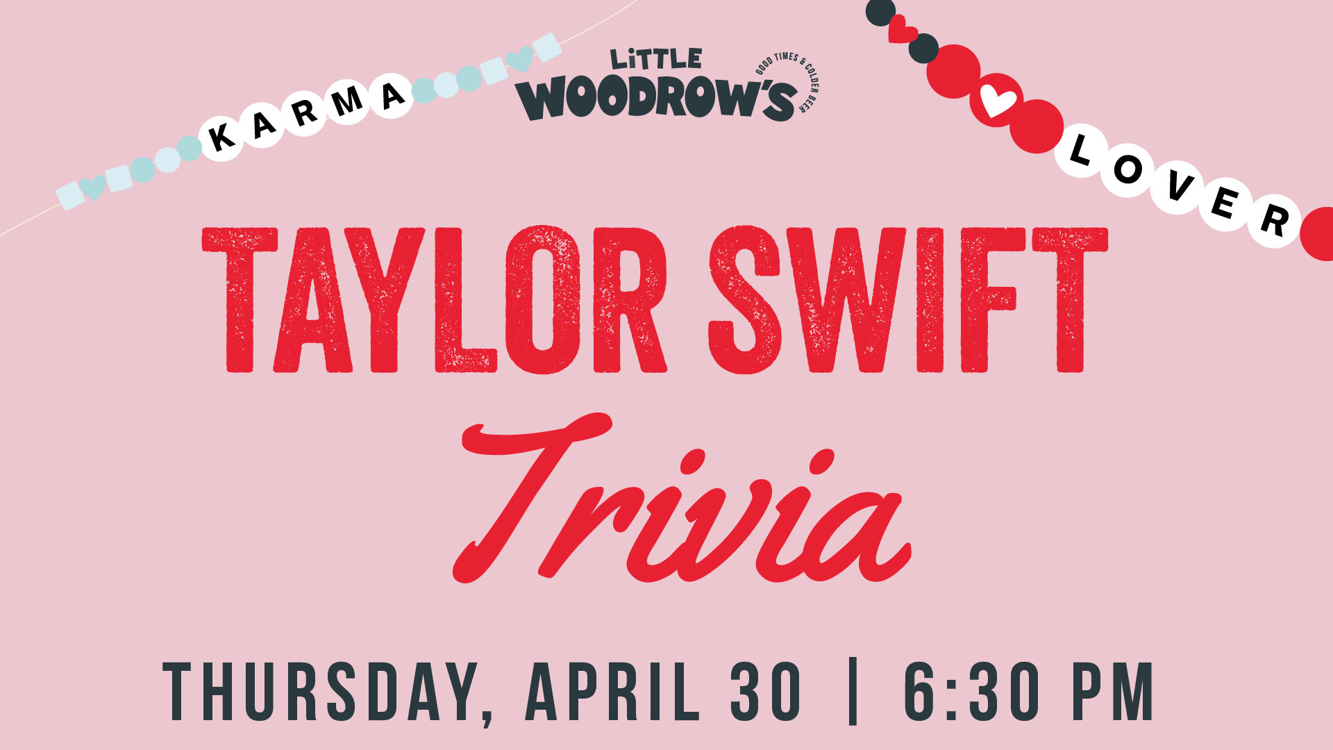 Are you ready for it?  Join us at 6:30 PM for a night dedicated to all things Taylor lyrics, eras, and iconic moments! Think you’ve got what it takes to be the ultimate Swiftie? Don’t miss it!